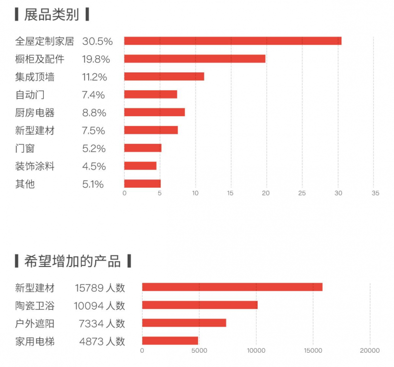 经过30余年的稳步发展,北京建博会已经从单一建筑材料延伸至涵盖建材领域上下游链条多类产品。2023北京建博会展品类别覆盖8大核心板块,多品类融合打造一体化设计、一站式购齐的整体家居空间解决方案,以展会为桥梁,提升产业链和供应链的韧性和效率。除了主打产品,观众希望补充增加的产品包括:新型建材、陶瓷卫浴、户外遮阳、家用电梯等产品。