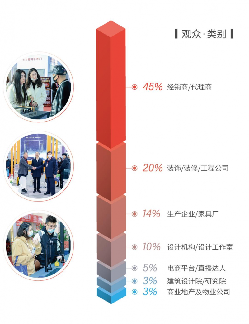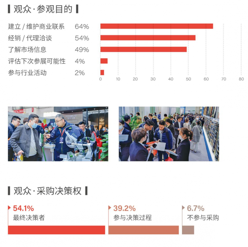 北京建博会一直致力于整合家居建材上下游资源、促成产业合作、助力参展企业达成交易,也正因为如此,获得了业界和客户的广泛认可和赞誉。据展会期间调研结 果显示,64%的观众来此建立新的商业联系,54%需要进行经销/代理洽谈。在所有参观者中,最终决策和参与决策过程的人占比93.3%。