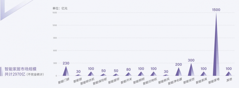 智能家居经过20年的发展,已形成了多个细分品类,北京建博会展示品类包括智能门锁、智能门、智能 晾衣架、智能窗帘、智能照明、智能扫地机、智能新风、智能净化器、智能安防、智能家具、智能家电等。据有关数据显示,目前智能家居市场规模约2970亿元。