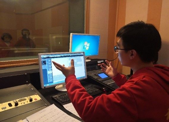 一句歌词,孩子们要录十几遍,甚至几十遍。通过杨老师的讲解,学生多次的录音活动,他(她)们自己也都成长了:虽然很累,但为了唱出好作品,再累也会很投入,高质量完成。录音结束后,有学生开玩笑的说:老师,您真是铁人,从早上一组一组的录音,一直到中午,您也不休息,真佩服!