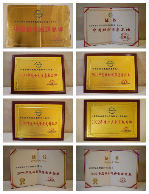 千年舟荣获“中国板材国家品牌”、“中国板材民族品牌”、“2022年度十大生态板品牌”、“2022年度板材优秀流通企业”、“2022年度板材优秀制造企业”,千年舟集团旗下柏菲伦获“2022年度十大全屋定制品牌”,千年舟集团旗下澳思柏恩获“2022年度十大刨花板品牌”、“2022年度板材优秀制造企业”。