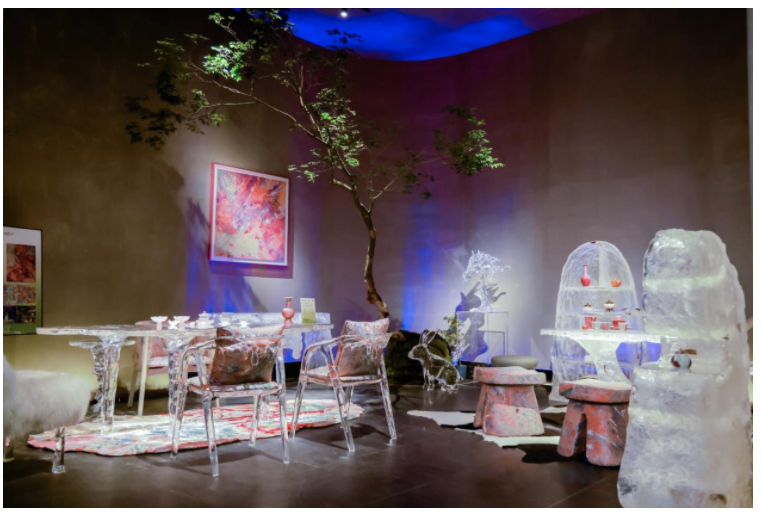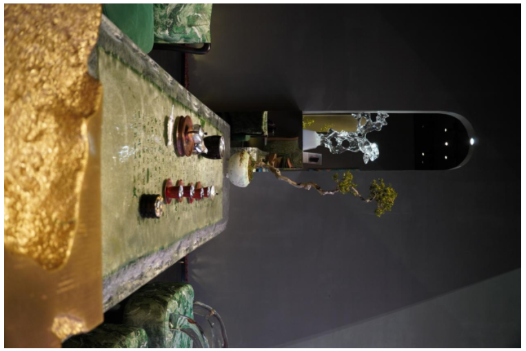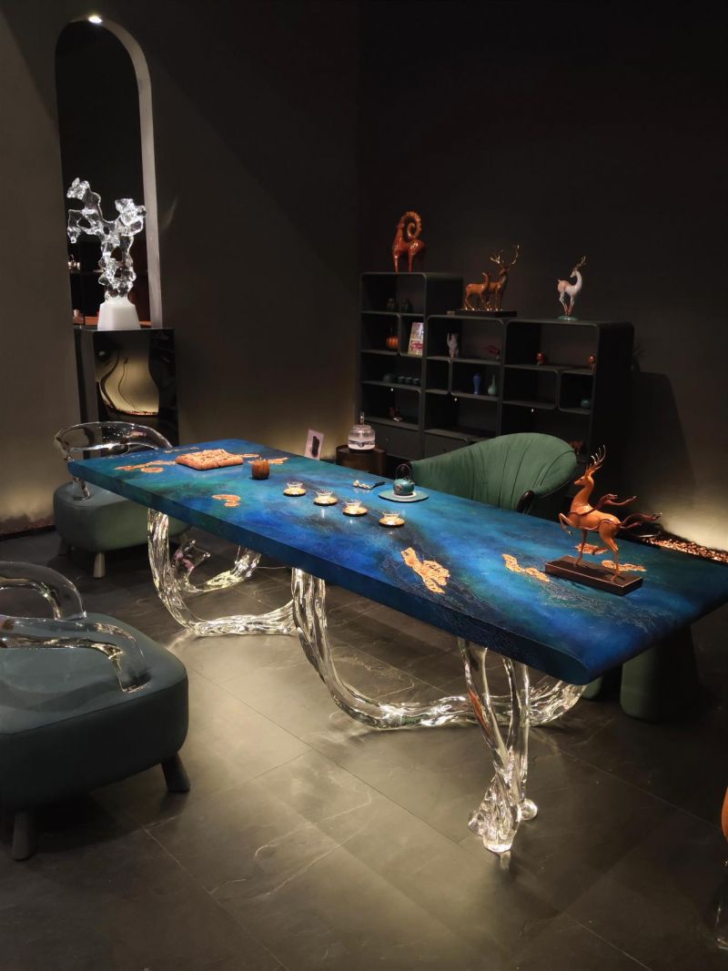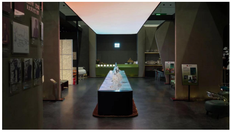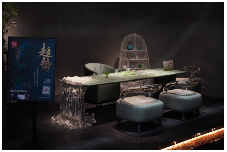 以去年推出就大放异彩的兰亭续系列为例,它的设计灵感源自旷世名作《兰亭集序》。国礼大师、中国现代织锦创立人、享受国务院政府特殊津贴专家李加林以《兰亭集序》原作为灵感,用现代织锦工艺将其还原,38000 多根桑蚕丝线,1亿9千万次交织,经纬之间,模拟绘画的肌理效果,表现出层次感、立体感,将这幅织锦《兰亭序》封存进冰岛水晶中,回溯着百年文明。通过织锦的形式将书法艺术的巅峰之作,再次呈现。尘封的历史岁月,宛如冰封。尤其是兰亭续茶桌,冰岛水晶与织锦的结合,展现了不同材质间的结合与碰撞,塑造出了一张摩登时尚、又富有东方韵味的茶桌,如同王羲之的书法一样,刚柔并济,文而不华,质而不野,温文尔雅,是现代工艺、传统艺术的集合。