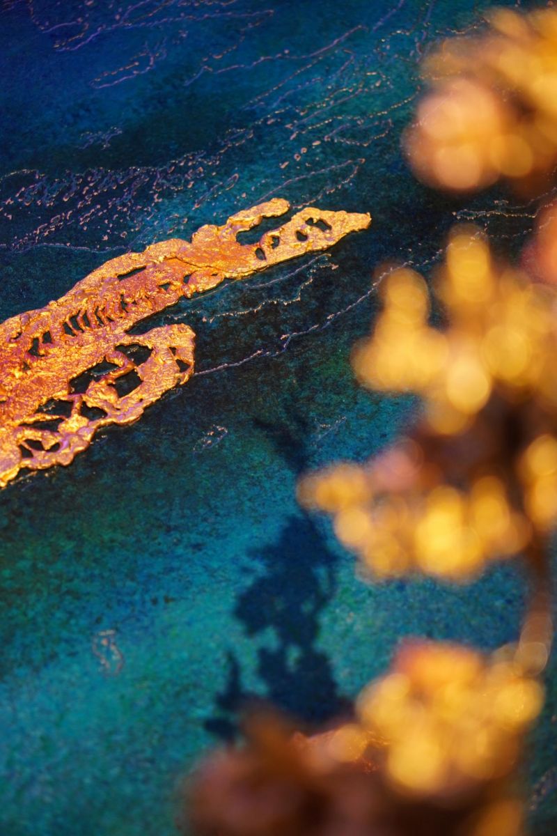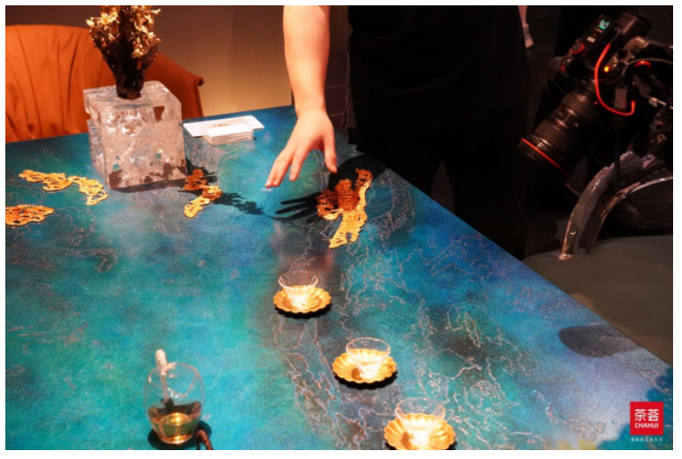 凭借着雄厚的研发实力,以及对茶文化与现代家居理念的深度洞悉,茶荟家居的茶文化家居产品矩阵越来越丰富,此次展出的万泉归海飞天系列就是今年推出的新品。中国工艺美术大师、国家级非物质文化遗产铜雕技艺代表性传承人朱炳仁以为博鳌亚洲论坛创造的《万泉归海》巨幅铜壁画为设计灵感,结合敦煌飞天元素展开设计,桌面以万泉归海为主题。茶桌整体采用铜加冰岛水晶材质,桌面是由朱炳仁独创发明的“熔铜多层雕琢技艺”,铜在熔融状态下随性奔腾,加以高温彩釉,形成绚丽色彩,泼墨绘制水墨画,局部以熔铜作为点缀,使画面内容更加饱满。