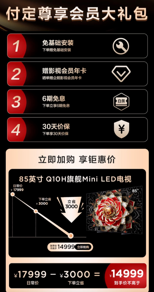 也正是基于以上这几点,我最终敲定了TCL Q10H电视,而且选择的是85英寸,毕竟屏幕越大、沉浸感越强,而且TCL 85寸Q10H在618期间下单立减3000元,到手14999元,同时还免除基础安装费、赠企鹅影视会员年卡、下单立享6期免息,以及30天保价等等,可以说优惠力度相当到位了,所以我迫不及待就下单了。