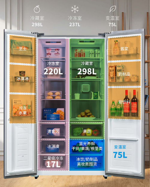 610L对开门设计,左冷冻、右冷藏,足够满足4~5口之家的需求。298L浩瀚冷藏鲜储,比得过一个小两门冰箱的容积;237L 超大冷冻,抵得过一个小冷柜;外加75L变温空间(-5~8℃),便于满足多样化的食材需求。内置多层搁架及抽屉,食材轻松分类收纳,一览无余。