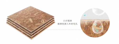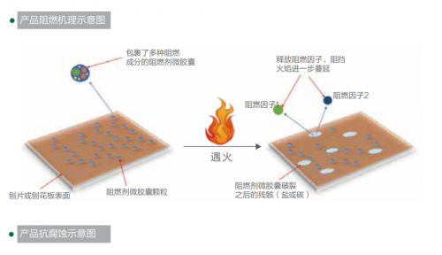 板材受热时,刨片表面的微胶囊破裂,吸收热量,同时释放的高效阻燃因子能稀释燃烧区域的可燃物浓度,有效抑制火焰蔓延。微胶囊破裂后,碳化、盐化的产物覆盖在刨片表面,阻止烟气溢出,实现阻燃抑烟的双重效果。