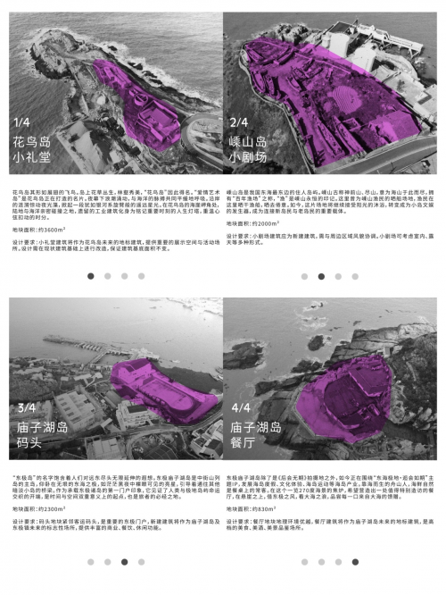 本次竞赛选择了花鸟岛小礼堂、嵊山岛小剧场、庙子湖岛码头以及庙子湖岛悬崖餐厅四个场景作为公共空间的建筑场域,基于场所本身的状态进行优化和改造。从海洋先民的文明、岛民的自然流动、海岛的生态等角度有效地介入每一座建筑的自然和人文语境,使它们重拾使命、更好地服务于小岛上的社区居民及途经的新岛民。