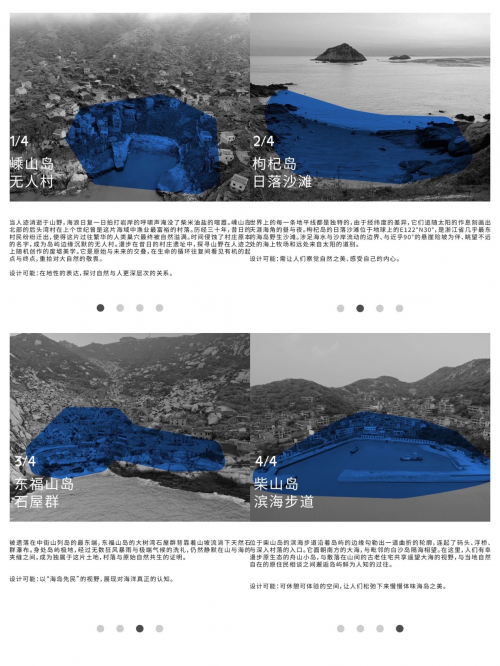 本次竞赛希望以大地艺术的名义将岛屿连线,联结成东海海域之上新的图案。以四座具有代表性风景的岛屿作为项目切入点:东福山岛石屋群、枸杞岛日落沙滩、柴山岛滨海步道与嵊山岛无人村,探索艺术装置在山峦、海滨、森林、村落遗迹之间的可能性。