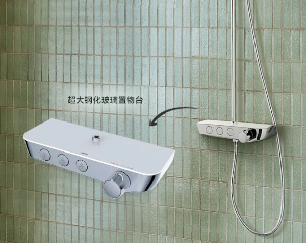 摩恩心朗系列恒温花洒设计了超大尺寸的置物台,将圆润边角与抗压钢化玻璃材质结合,让我们在沐浴时触碰和随手放置物品安心又安全。此外,置物台上的多重功能控制按钮,还能解决沐浴时花洒和温度闭眼调节、切换困难的问题,随手就可以触摸切换出水模式,沐浴体验直线上升。