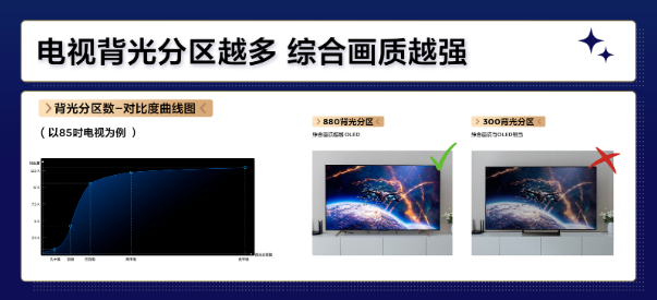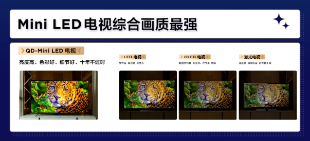 原因是Mini LED电视灯珠芯片达到百微米级,拥有更为精细、密集的背光分区,实现局部区域的背光控制,从而在画面上实现更深邃的黑色和更明亮的白色,提高了对比度和画面细节表现,综合画质对比其他显示技术有显著优势。
