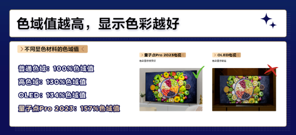 再加上量子点Pro 2023技术的加持,画面显色能力更强,高达157%色域让画面显示的色彩更接近真实世界的色彩表现,就像画面中同种水果不同的品相,能清晰看到色彩细微差异和过渡变化,仿佛各种品类的水果就摆在眼前,让人垂涎欲滴。