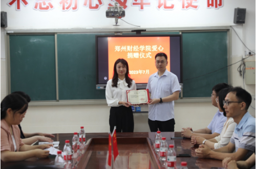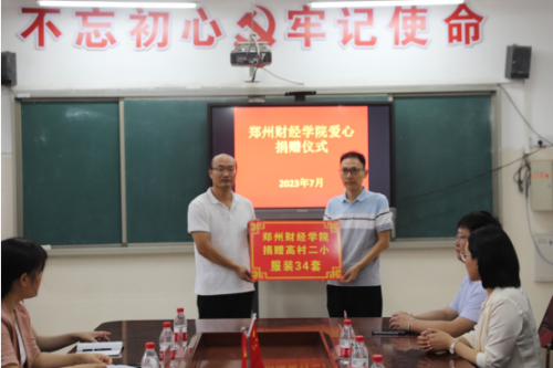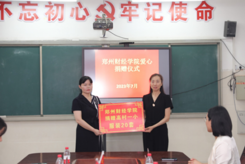 随后,郑州财经学院团委书记周二涛、校工会副主席袁清分别向高村乡一小、二小校长捐赠物资。高村乡副乡长杨静向郑州财经学院外国语学院党总支书记闫静授予捐赠赠书。