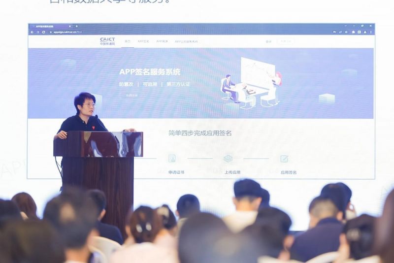 中国信息通信研究院泰尔终端实验室信息安全部专家王宇晓介绍了《开放生态下APP身份可信“利器”》议题,针对APP签名目的、技术实现、建设情况以及给开发者带来的价值进行了详细解读。