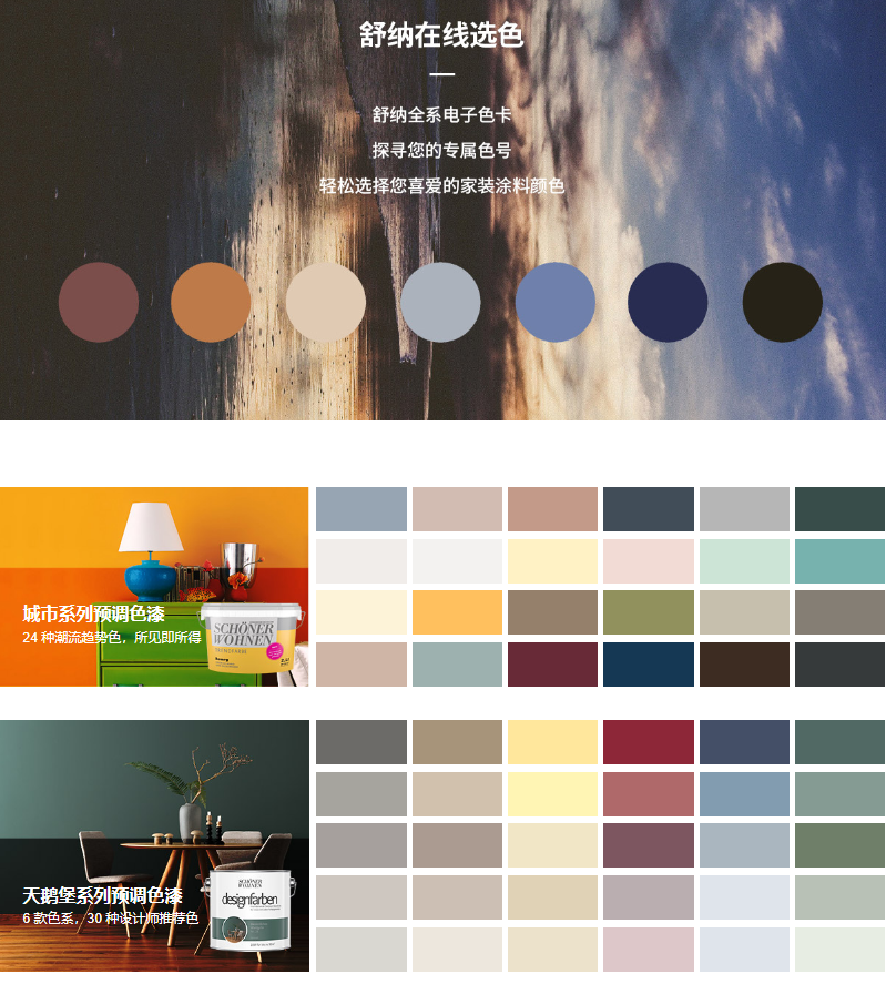 用户可通过舒纳沃恩官网、官微、舒纳屋智慧商城小程序等多个渠道提前查看舒纳全系色卡,选出心仪色号。