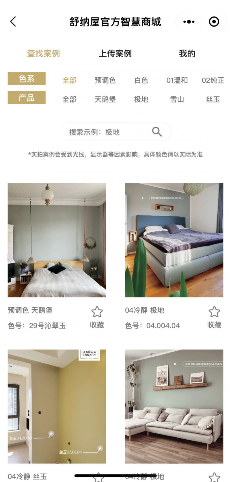 用户可通过舒纳屋官方智慧商城小程序、舒纳沃恩pc端官网查看真实案例。通过更直观的实刷案例,获取装修灵感,以及所选色号的实刷效果。