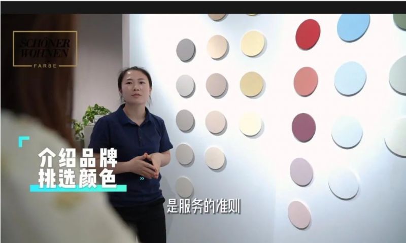 现场接待人员会为感兴趣的顾客讲解品牌、产品相关知识,耐心倾听顾客需求,推荐最适合顾客的产品。并且通过专业的色彩搭配知识,为顾客选择最优的色彩搭配方案。还会现场试色,让顾客直观感受所选色号的实刷效果。