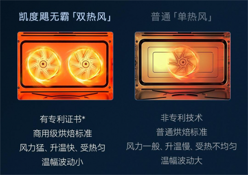最后,微魔方还搭载了凯度2020年正式推出颠覆烘焙领域传统标准的独门绝技——「飓无霸」双热风专利技术,风力更猛、升温更快、受热更匀、温幅更稳。而此次,凯度首次将这项技术运用于微蒸烤领域,极大地改善了上色效果和食材的嫩熟程度,使烘焙效果可媲美商用级标准。