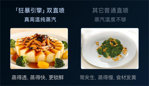 1100W变频微波+2700W「狂暴引擎」双直喷大蒸汽,变频微波由内深入食材肌理,澎湃蒸汽由外立体裹蒸,食材软嫩鲜美,营养健康;