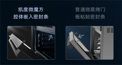 其次,凯度「微魔方」系列新品运用了专利级的密封技术,该技术能够强力封印蒸汽和微波。不同于市场上绝大多数微蒸烤箱将密封条设计在门板上,凯度创新性地将密封条设计在腔体上,从而有效扩大了空间,耐超高温密封条的宽度提升了约1倍,吸附力得到了大幅提升。这种设计使得密封条与腔体更为贴合,使玻璃门板更平整,贴合度更高,进而提升了高达3倍的微波防泄漏密封效果!此外,微魔方还采用了可更换和可调整的密封条设计,方便取装,无惧老化和压力变形。