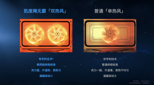 2017年,为了达到更均匀的烘烤效果,凯度研发出了双热风技术,并在2019年应用于蒸烤箱,革新行业新标准;