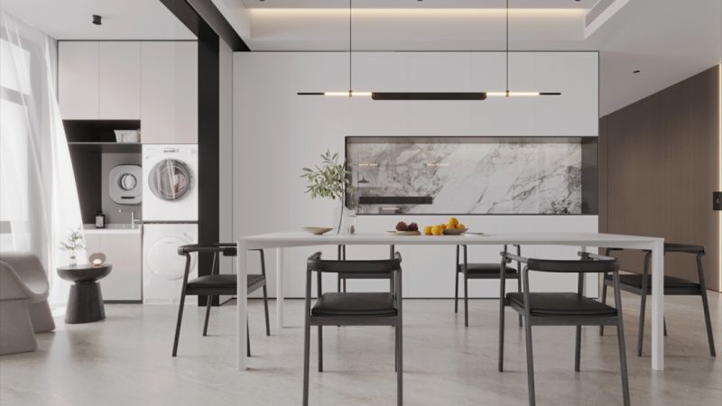 餐厨一体设计,不做分区,形成一个大的开放式空间。继续采用「冠珠华珍」广漠黄岩板,进行延伸铺贴,将客厅与餐厨区之间的动线化作整体,丰富了日常生活的空间动线也为屋主提供了灵活的生活方式。全景落地窗“框景成画”将用餐环境与自然场景完美结合,用透明的玻璃门进行生活功能划分。打开时形成和谐的统一空间,关闭时则方便隔绝烹饪的油烟,打造视觉和味觉的双重家居感受。