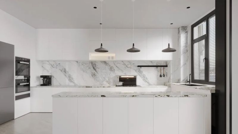 一字型布局+嵌入式柜体,满足收纳、烹饪、整洁的生活需求,吊柜与橱柜之间,选用冠珠十里银湾岩板上墙铺贴,如无垠海岸线般延伸的质感肌理。将家居空间演绎得清爽唯美,令人心醉沉沦。
