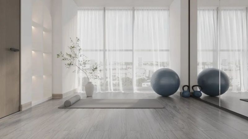 个人的独处空间,是个性、爱好的空间梦想呈现。用极简设计打造纯粹功能空间。地面通铺冠珠橡木-浅灰,防滑耐用的材质。不仅满足自然氛围的打造,还能保证日常运动的安全和生活的便利,收纳柜、落地镜、瑜伽垫的合理配置,预留出更多空间用于运动,打造秩序整洁之美。