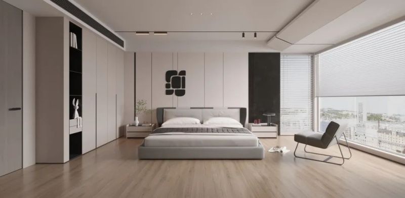温柔的浅色系让卧室显得亲和温馨,床头背景墙横铺冠珠米兰布纹-米灰岩板。米兰布纹的肌理搭配上舒适的床品,打造一个如同梦境般的质感空间。右侧的同色系通顶收纳柜,不仅能扩容收纳,还能延伸空间宽度,轻松打造治愈系卧室。