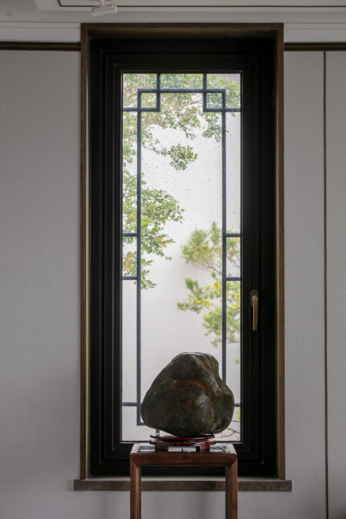 落地玻璃窗和中式花式窗棂组合,既连接室外自然风景,又将东方设计与现代时光串联起来,好像是一首叙事的抒情诗,花景、阳台、石子......在沉静与雅致的意境里,让生活衍生出不同的体验,每一种皆是幸福。