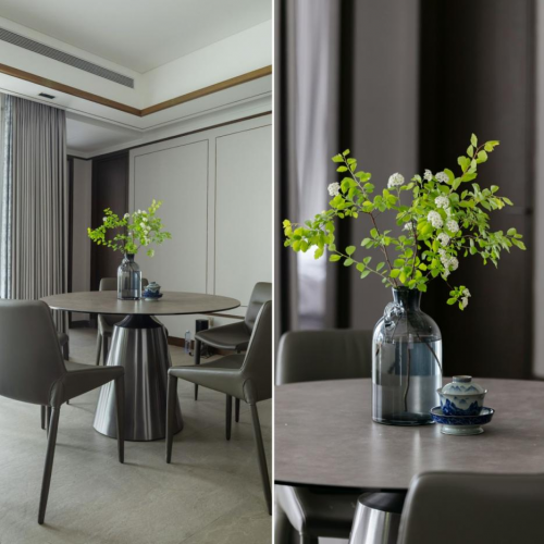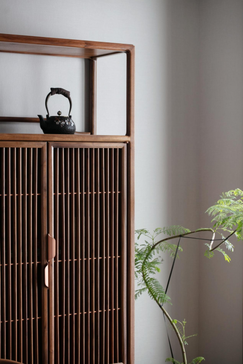 在茶室里,一瓷一器,以精致的方式与日复一日得以悉心照料的绿植相映衬,尽显东方茶室的禅静;屋主收藏的茶器、边柜散发出的木香,在这个东方茶镜的空间里,注入了对生活的用心与热爱,让时光慢煮,写照着优雅。