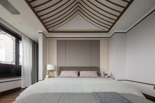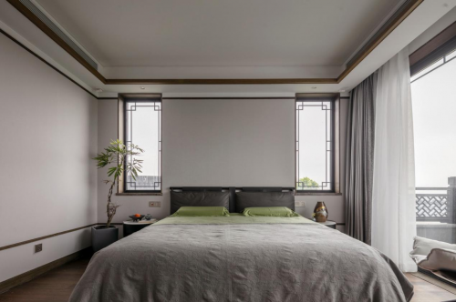 整个卧室中式以建筑设计为基础,大面积地采用柔和的灰色与木色,常见的材料,力求保留着中式最原始的质感,却以简化的方式传递现代居所应有的宁静。