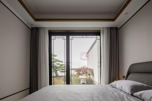 另一个卧室与庭院直接相连,设计中最大程度地保留了与户外的关系,将自然风景框入视线之内,素雅的氛围勾勒出轻盈的观感,这大抵就是东方新韵。