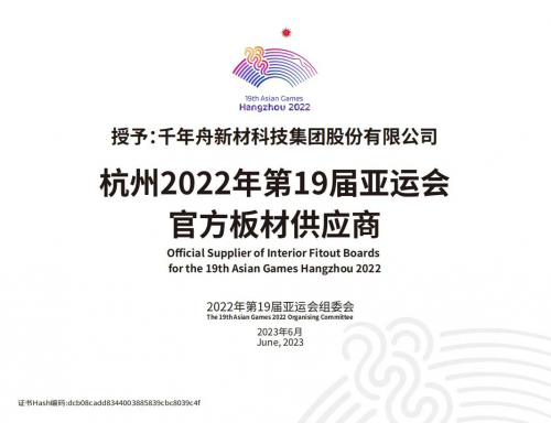 千年舟作为诞生于杭州的家居行业龙头企业,肩负大国品牌和浙江儿女的使命与担当,正是以完美契合亚运理念的绿色品牌发展历程,荣耀成为亚运官方指定板材,为家乡杭州贡献自己的力量,也为本届盛会刻画下专属板材印记,这不仅仅是亚运会对千年舟品牌的认可,更是市场对千年舟品牌的认可,背后承载更大的意义,则是中国板材行业踏出世界的一大步。