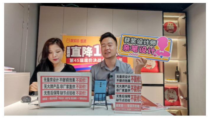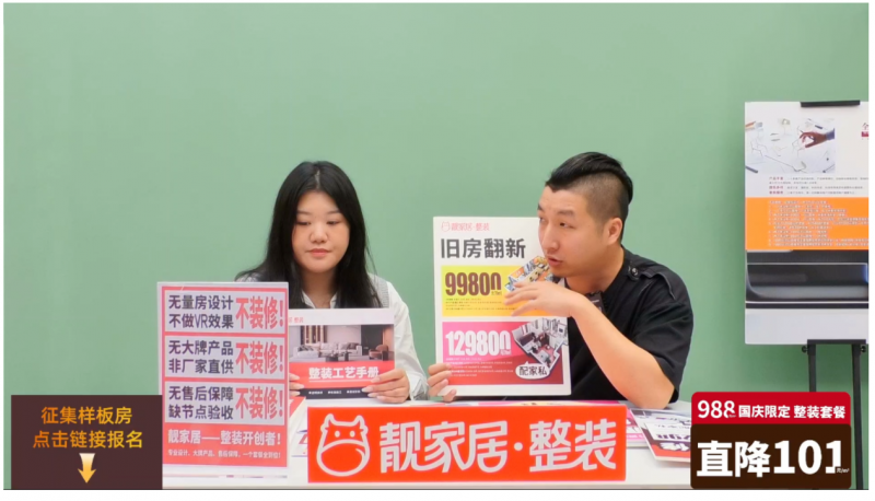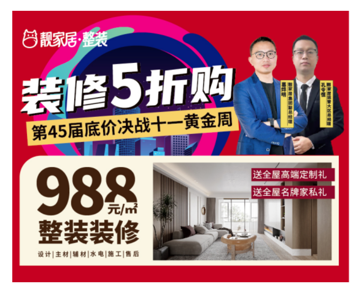 靓家居超宠粉,不仅有装修五折购,更有988元/㎡国庆限定超值套餐火爆抢购,签装修每平米直降101元,免费升级大牌主材辅材,仅限300套!数字化设计体验官全城招募:获奖设计师团队专业设计,金牌项目经理施工,在直播间报名就送全屋VR效果图!