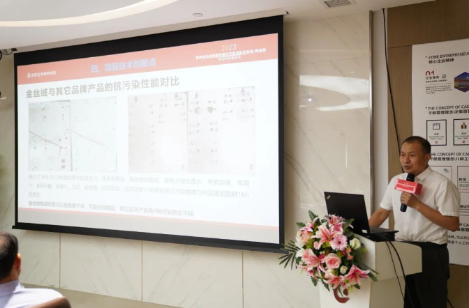 金牌企业副总裁汤浩首先在鉴定会上向鉴定专家团成员的到来表示热烈的欢迎,并对此次金丝绒超抗污的工艺技术接受鉴定充满信心。