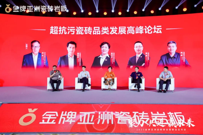 随后,万众期待的超抗污品类发展高峰论坛震撼发声,佛山市陶瓷行业秘书长尹虹博士、中国建筑卫生陶瓷协会副会长徐熙武、金牌企业副总裁汤浩、金牌企业制造副总裁张代兰、金牌亚洲宜宾经销商向举五位重磅行业大咖上台畅所欲言,共同探讨超抗污柔光砖的发展和应用前景,为行业超抗污柔光砖的发展方向提供强有力的支撑。