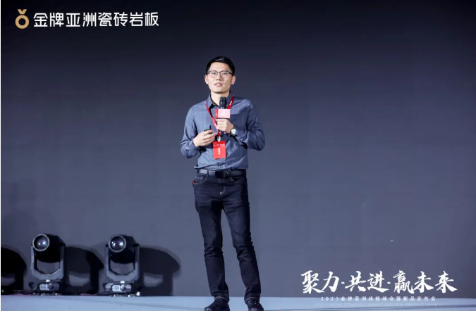 面对家居需求多元化时代消费转型、用户年轻化等转变,金牌亚洲凭借其深厚的技术积累和敏锐的市场洞察力,一直走在行业的前列。会上,金牌企业产品总监黄旺明重磅发布金牌亚洲2023高端质感新品——【石光悦色】高端质感柔光砖。