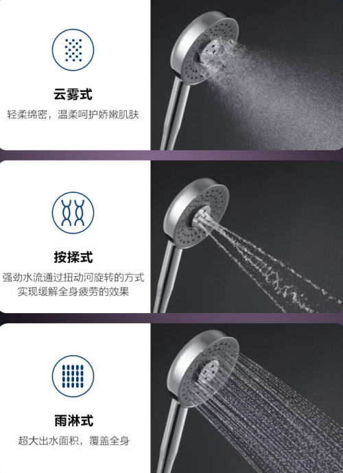 除了炫酷的外观,科勒水乐章多功能手持花洒更有着不同凡响的“内在美”。它让你的淋浴彻底告别了单一水型,丰富水型让淋浴变成了不一样的享受,带给你沉浸式的幸福体验。打开花洒,你可以选择雨淋式水型,有130mm超大出水面积,覆盖全身,享受大雨的酣畅淋漓。你也可以选择按揉式水型,强劲的水流通过扭动和旋转的方式,形成缓慢的、有节奏的按捏效果,仿佛有一双手在给你按摩,可有效缓解身体疲劳。当然,你还可以选择云雾式,让超细柔和的水滴汇聚在一起,轻抚你的身体,宛如置身温暖的环抱中,带来幸福的淋浴体验。科勒水乐章多功能手持花洒共有3种丰富独特的水型,不同舒心体验,总能满足你的需求