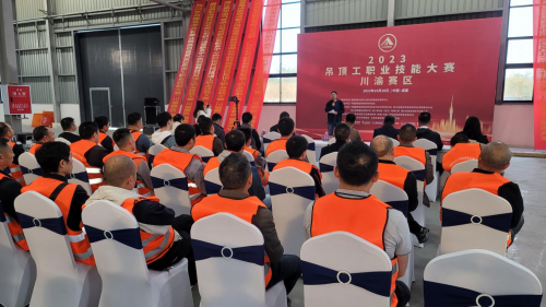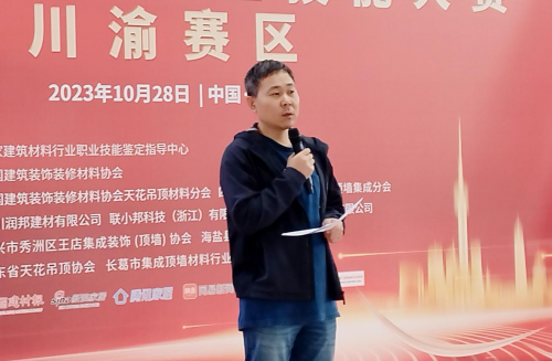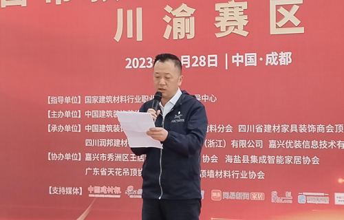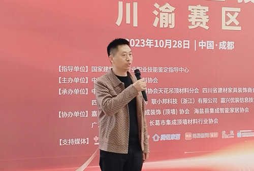 承办单位代表,分会副会长、四川省建材家具装饰商会顶墙集成分会会长、四川润邦建材有限公司总经理张先文上台致辞,他表示感谢川渝地区的安装工师傅过来参加本次比赛,鼓励参赛者要坚持不断学习和提升自身的能力,只有不断创新、不断超越,才能为行业的繁荣作出贡献。本次大赛始终秉持着“公平、公正、交流、选才”的宗旨,搭建吊顶安装交流平台,让吊顶行业安装工精英们汇聚一堂,切磋技能,交换吊顶安装心得,共同营造积极向上,相互学习的吊顶技术安装环境;竭诚营造尊重技能、崇尚技能的行业氛围。在接下来的比赛中,愿大家赛出友谊,赛出水平,从而更大力度的推动吊顶行业企业高质量飞速发展。