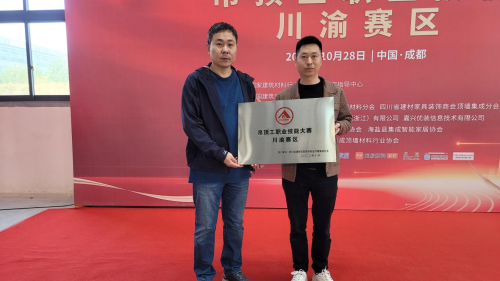 随后,丁辉秘书长为本次川渝赛区执行单位授牌,分会副会长、四川省建材家具装饰商会顶墙集成分会会长、四川润邦建材有限公司总经理张先文上台接受授牌,本次授牌仪式象征着对该执行单位在组织和推动本次比赛中所做的努力和贡献的认可和表彰。