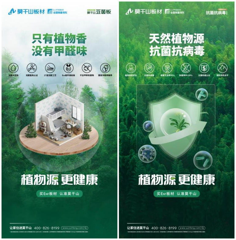 植物源系列产品采用植物原材料,极大地改善了板材的功能性,在本次双十一活动中受到了消费者的广泛好评。作为植物源明星产品的豆茵板和抗菌抗病毒板,更是以领先于其行业水平的技术优势掀起了国内家装环保浪潮。豆茵板运用了自主研发的大豆蛋白胶,可以有效避免板材加工中所产生的甲醛、苯酚等毒害物质,其甲醛释放量远低于国标ENF级所规定的0.025mg/m³;抗菌抗病毒板应用板蓝根、金银花、艾草等植物提取的抗菌抗病毒因子,对多种常见细菌病毒的灭活率达到99%以上。