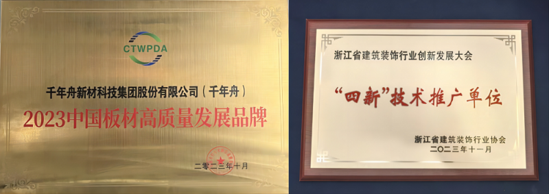 凭借在绿色创新领域的突出贡献,千年舟先后荣获健康建材品牌建设单位、健康建材品牌示范单位、中国板材高质量发展品牌、“四新”技术推广单位等多项荣誉,用切切实实的行动、来自行业的广泛认可,来自消费者的由衷喜爱,诠释什么叫“向绿先行”