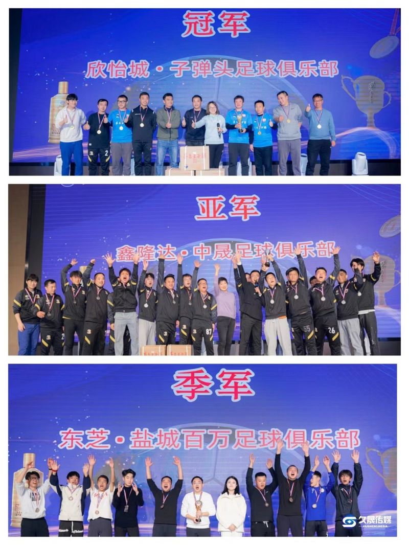 最后,到了全场瞩目时刻,就是颁发季军、亚军、冠军奖项,东芝•盐城百万足球俱乐部、鑫隆达•中晟足球俱乐部、欣怡城•子弹头足球俱乐部在大家的祝贺和掌声中依次登台领奖,他们为这来之不易的团队荣誉而激情庆祝。21点08分,主持人久久宣布颁奖典礼圆满落幕!