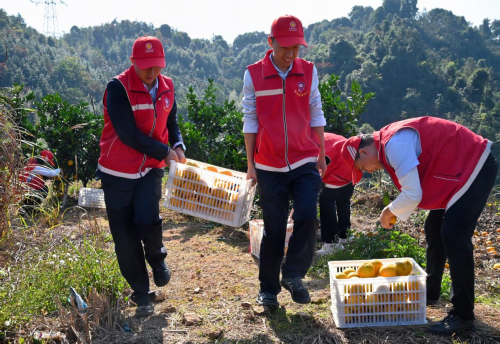 果园里黄澄澄的脐橙挂满枝头,处处弥漫着香甜气息,令人垂涎欲滴。志愿者们走进果园、亲近自然,与果农共同分享丰收的喜悦,体验采摘的乐趣。“一只手捏着脐橙,另一只手用剪刀把脐橙从果柄处剪下,避免损伤果树,摘下后轻拿轻放。”采摘中,李大爷为志愿者示范如何正确采摘脐橙,志愿者们了解采摘注意事项后,秉着不怕脏、不怕累、不怕热的精神穿梭在果园里进行采摘工作,两三人一组共同摘脐橙、装脐橙、运脐橙,大家分工明确、配合默契、干劲十足、效率极高,果园里一片繁忙的景象。“最近脐橙采摘,订单暴增,我们采摘人手明显不够,要不是你们来帮忙,今天的订单都不能准时发货,多谢你们帮忙,解决了燃眉之急。”果农李大爷笑眯眯地说着。