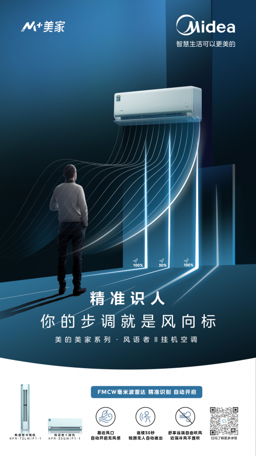 从老年人的智能诉求发力, 美的无风感空调风语者系列产品具备微多普勒时频分析的人体感知及智能舒适控制技术,能精准识别老年人位置和活动状态,实现了在空气、用户、机器三大维度上的全面感知,例如,在睡眠过程中,则会自动调低风速,数秒后关闭显示屏,呵护老年人睡眠,让老年人可以沉浸式体验智能化带来的幸福感。