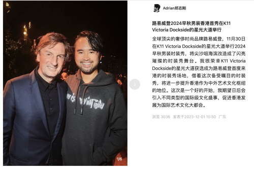 新世界发展行政总裁兼K11集团创办人郑志刚表示:“很荣幸K11 Victoria Dockside获选成为Louis Vuitton首度来港的时装秀场地。这一全球瞩目的时装秀,将进一步提升香港作为中外艺术文化枢纽的地位。这次只是一个好开始,我期望日后会引入不同类型的国际级文化盛事,促进香港发展为国际艺术文化大都会。”