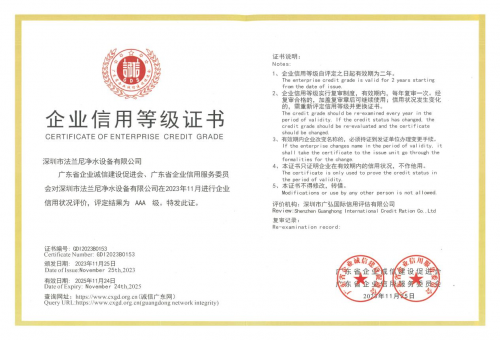 法兰尼连续三次蝉联“企业信用评价AAA级信用企业”最高评级认定,既是对公司的信用水平和经营能力的肯定和认证,同时也是对公司勇立潮头、奋进创新的一种激励和鞭策!作为净水器十大品牌高新技术企业,法兰尼将始终坚持诚信立企兴业,传承工匠品质,优化企业服务,不断强化契约精神和履约意识,重合同、守信用,持续加强企业诚信体系建设,展示诚实守信的企业形象,旨在为客户提供更高品质的产品和更专业化的服务!