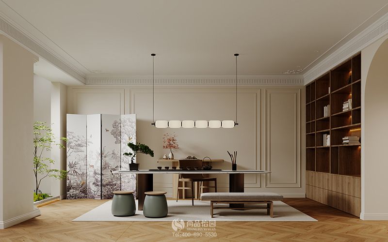 设计师利用经典的鱼骨拼地砖、石膏线条、装饰画、折叠门、清爽葱郁的绿植,为空间增加轻盈感和自然感,打造出通透惬意慵懒的公区空间。