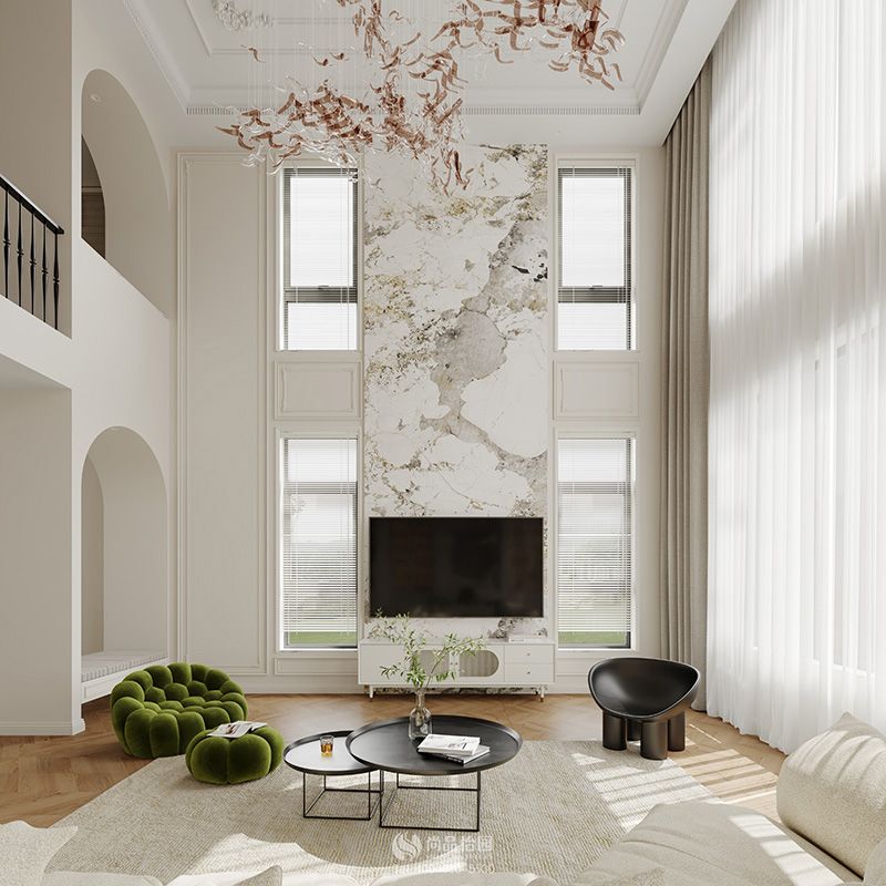 客厅区域的设计强调大气与轻奢,设计师将一二楼区域的客厅空间打通,利用高度打造空间的磅礴感。色系则永优雅的奶油白,以中和空间带来的压迫感。