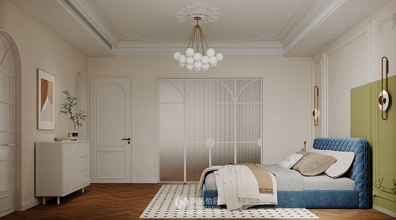 主卧沿用的还是与其他看见一致的奶白色,同时借用深蓝色的床来营造空间的静谧感。对称式设计的背景墙再利用绿色块打破对称感,简约而又不失俏皮感。